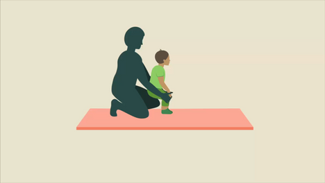 Поставете го детето така што ќе биде наведнато (свиткано) нанапред, на мека подлога на подот. Охрабрете го детето да се исправи и да седне така што ќе се оттурне со рацете од подлогата. Користете играчки или било што друго што ќе го натера детето да сака да се исправи во правилна седечка положба.