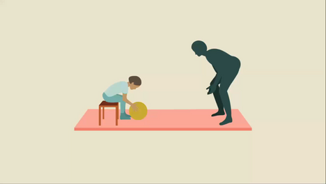 Детето нека легне на стомак, или на топка за пилатес, или на валјак, со рацете испружени пред себе, и нека се наведне напред за поддршка со рацете, а потоа самото нека се поттурне наназад. Следниот чекор е да му се дозволи на детето да остане во положбата некое време со испружени раце и да вежба да подига една по една рака.